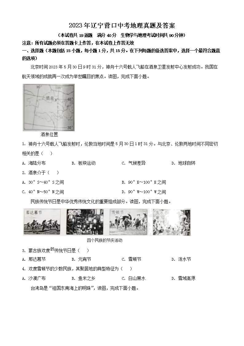 【文档名称】 2023年辽宁营口中考地理真题及答案(Word版).doc