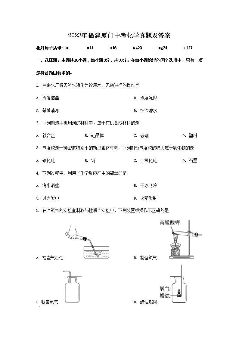 【文档名称】 2023年福建厦门中考化开云kaiyun(中国)真题及答案(Word版).doc