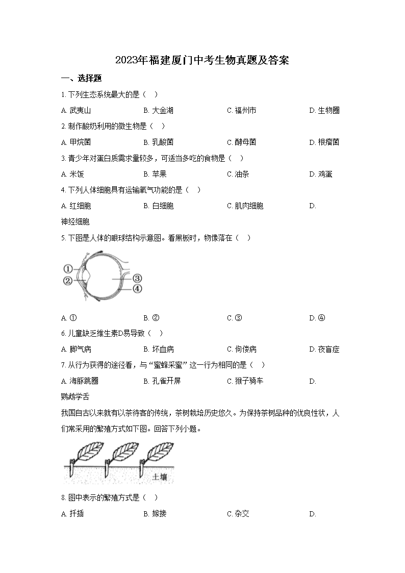 【文档名称】 2023年福建厦门中考生物真题及答案(Word版).doc