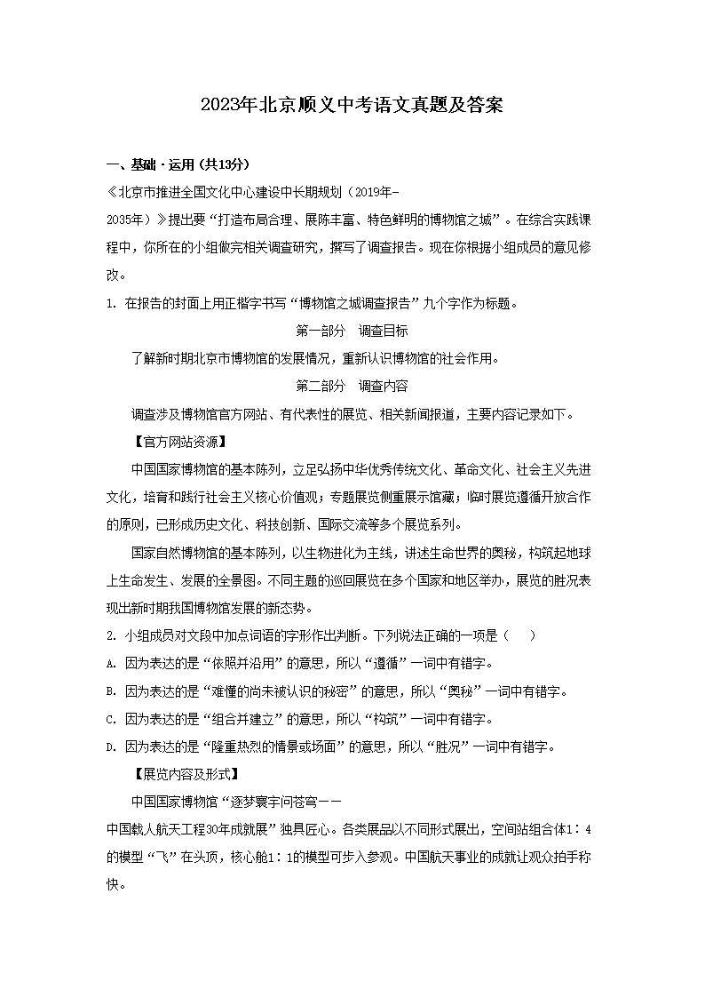 【文档名称】 2023年北京顺义中考语文真题及答案(Word版).doc