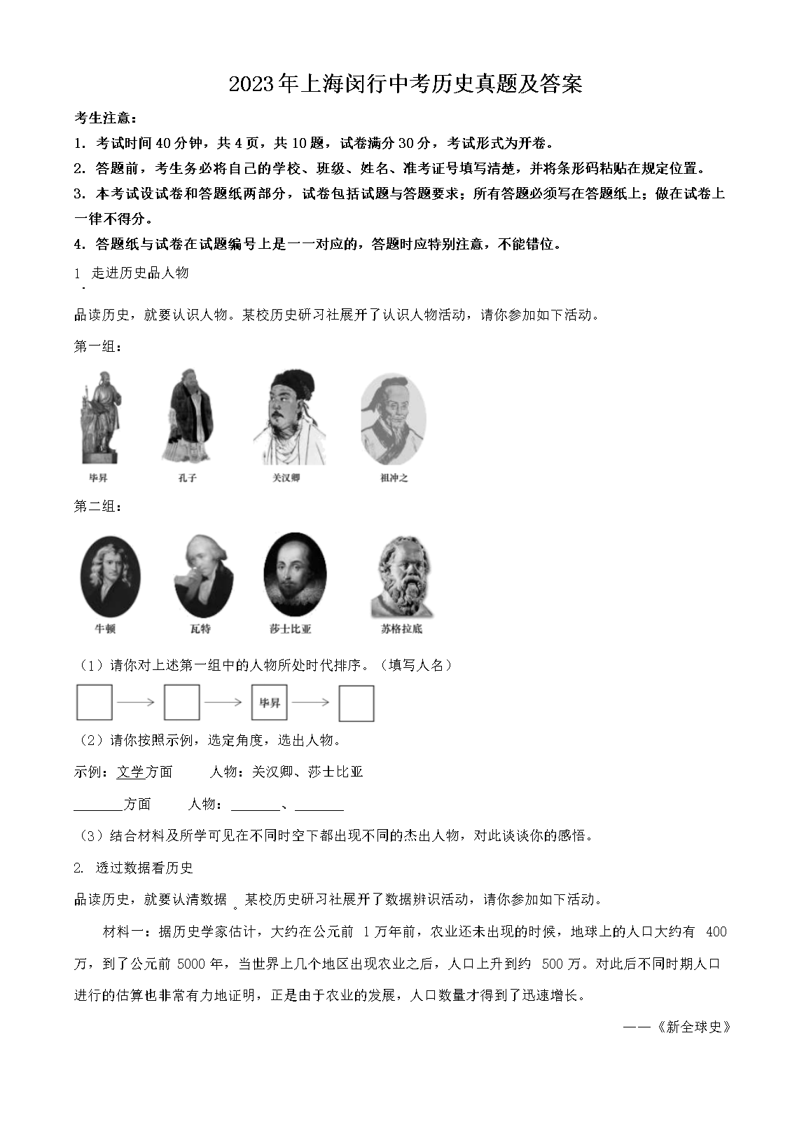 【文档名称】 2023年上海闵行中考历史真题及答案(Word版).doc