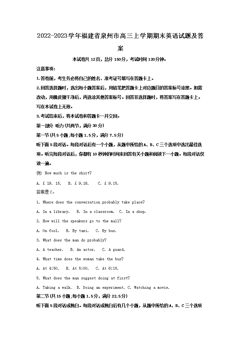 2022-2023开云kaiyun(中国)年福建省泉州市高三上开云kaiyun(中国)期期末英语试题及答案(Word版)