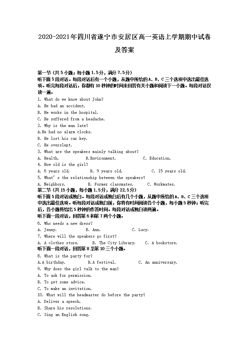 【文档预览】 开云网页版整理发布2020-2021年四川省遂宁市安居区高一英语上开云kaiyun(中国)期期中试卷及答案(Word版),前五页预览如下: