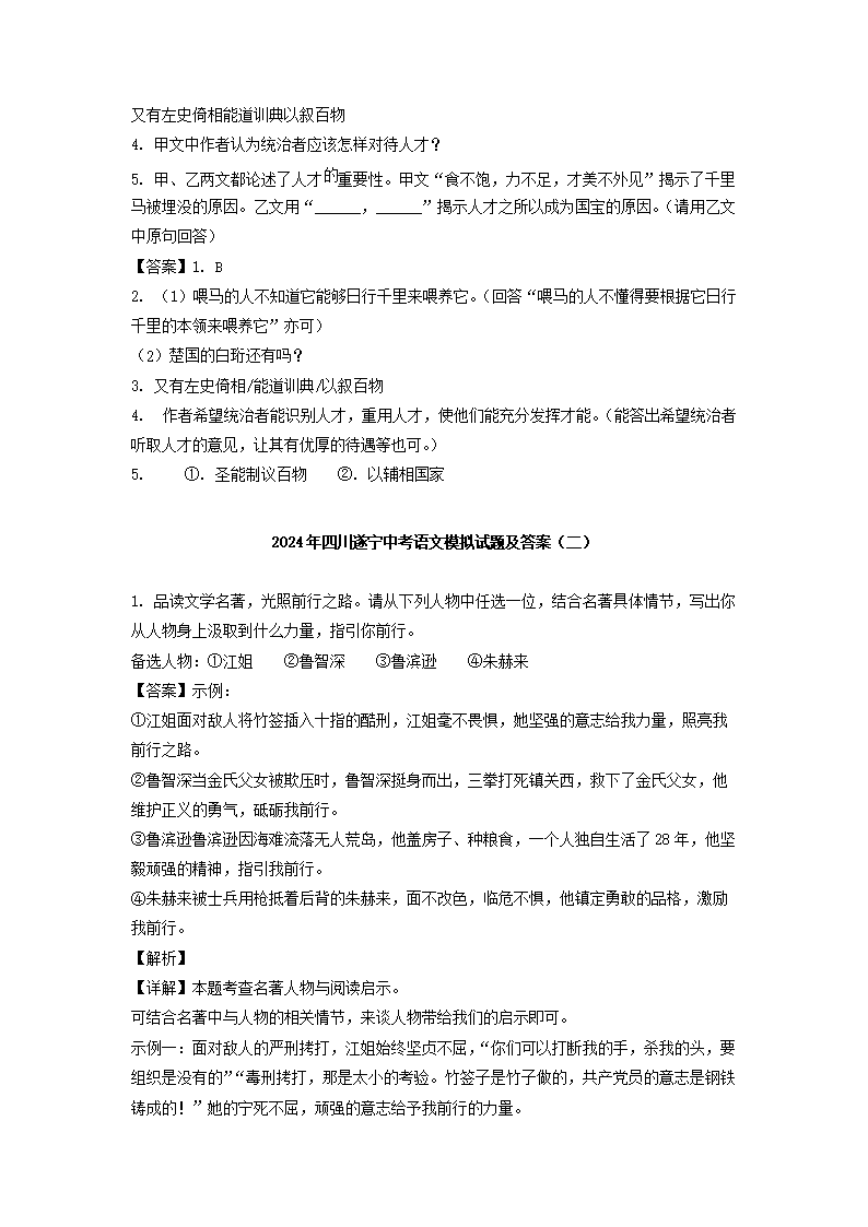 【文档名称】 2024年四川遂宁中考语文模拟试题及答案(Word版).doc