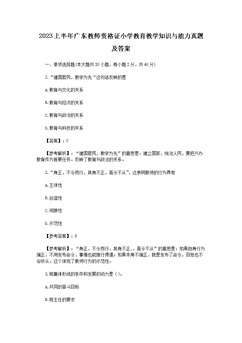 2023上半年广东教师资格证小开云kaiyun(中国)教育教开云kaiyun(中国)知识与能力真题及答案(Word版)