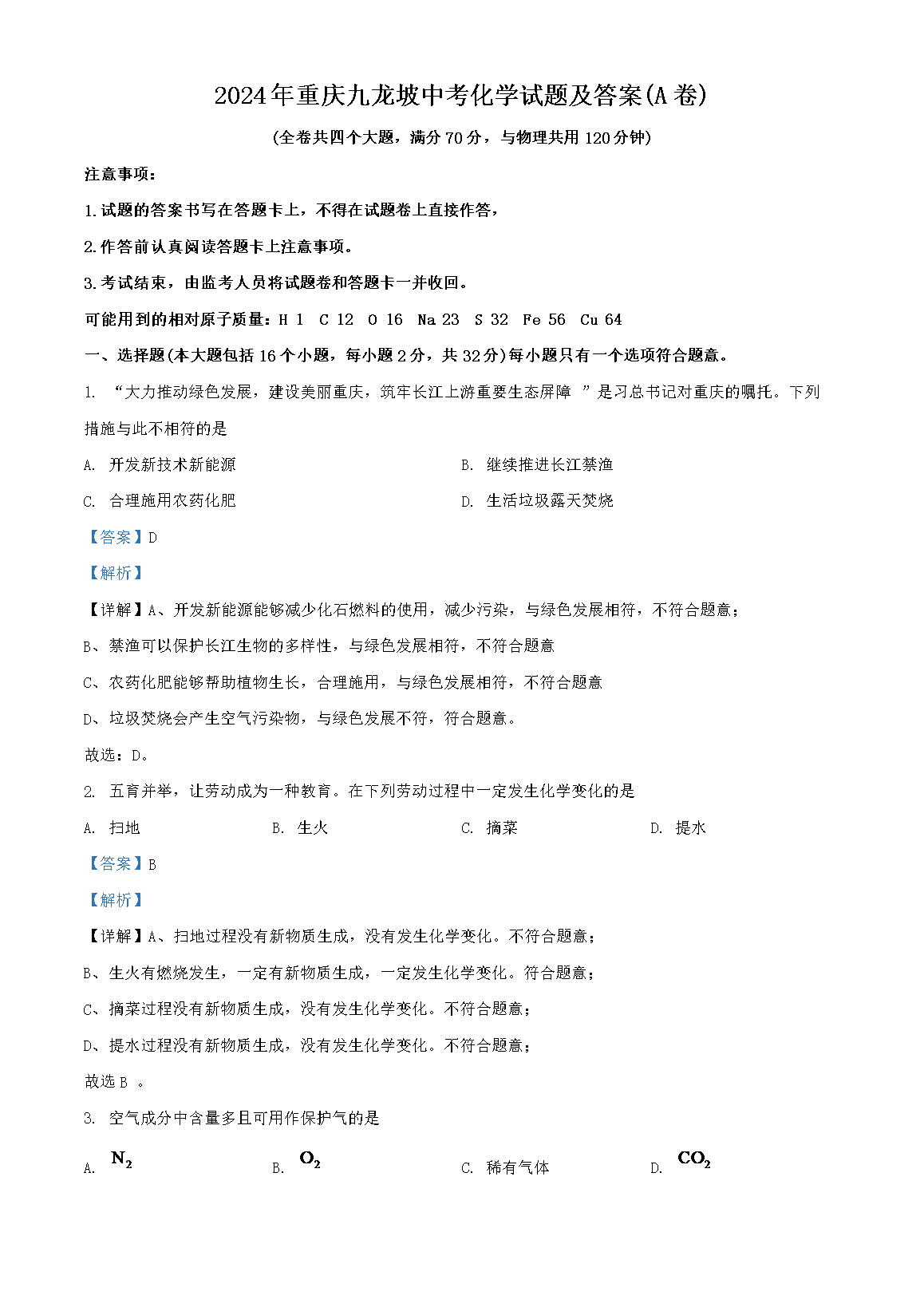 【文档名称】 2024年重庆九龙坡中考化开云kaiyun(中国)试题及答案(A卷)(Word版).doc