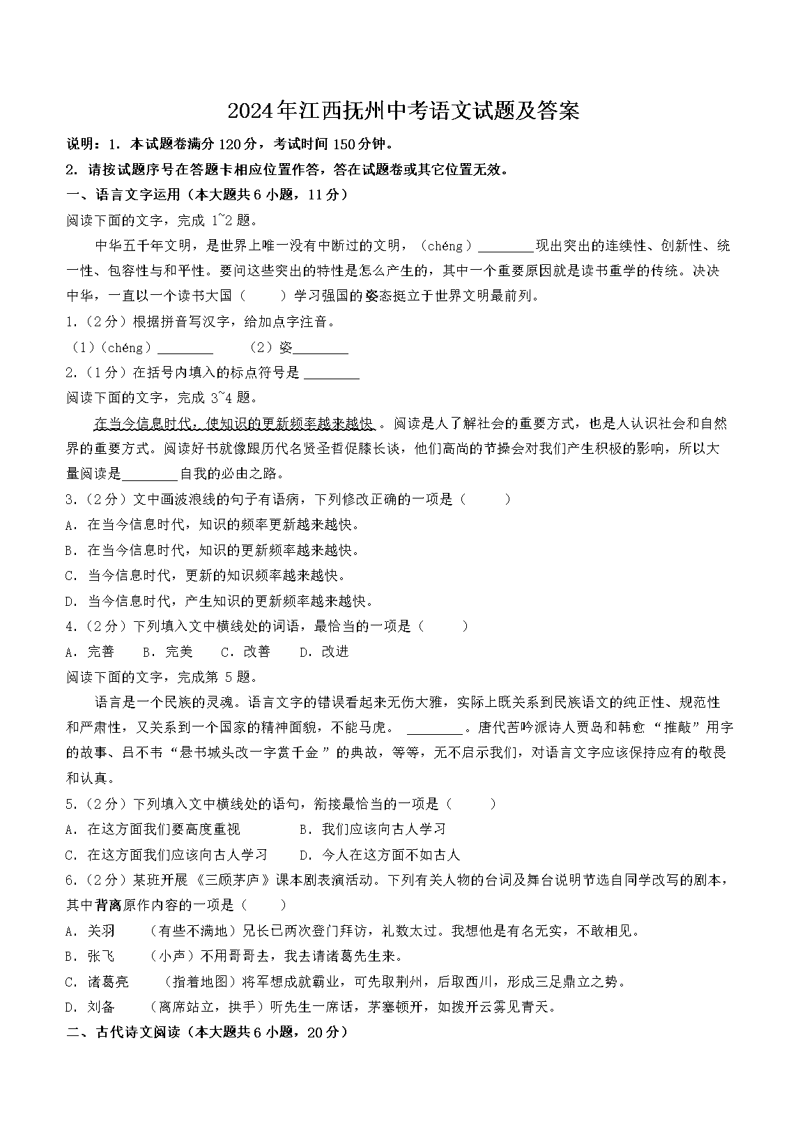 【文档名称】 2024年江西抚州中考语文试题及答案(Word版).doc