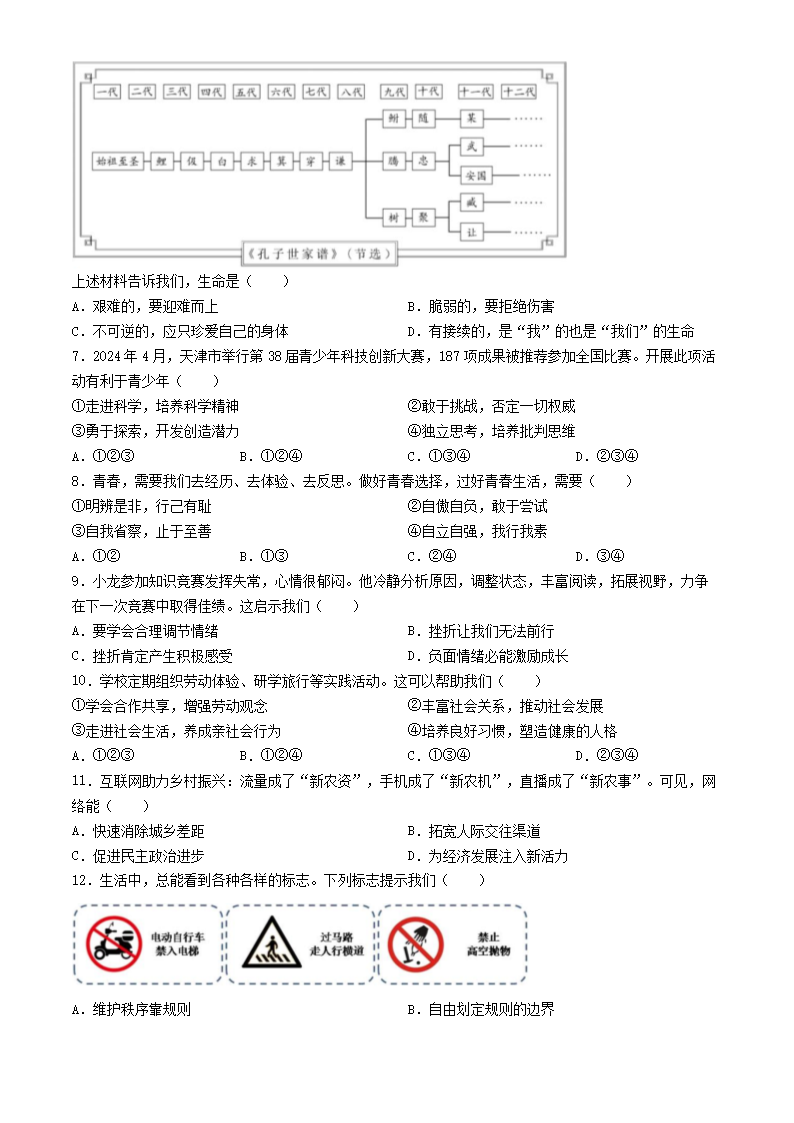 【文档名称】 2024年天津东丽中考道德与法治试题及答案(Word版).doc