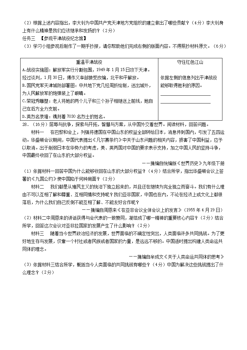【文档名称】 2024年天津汉沽中考历史试题及答案(Word版).doc