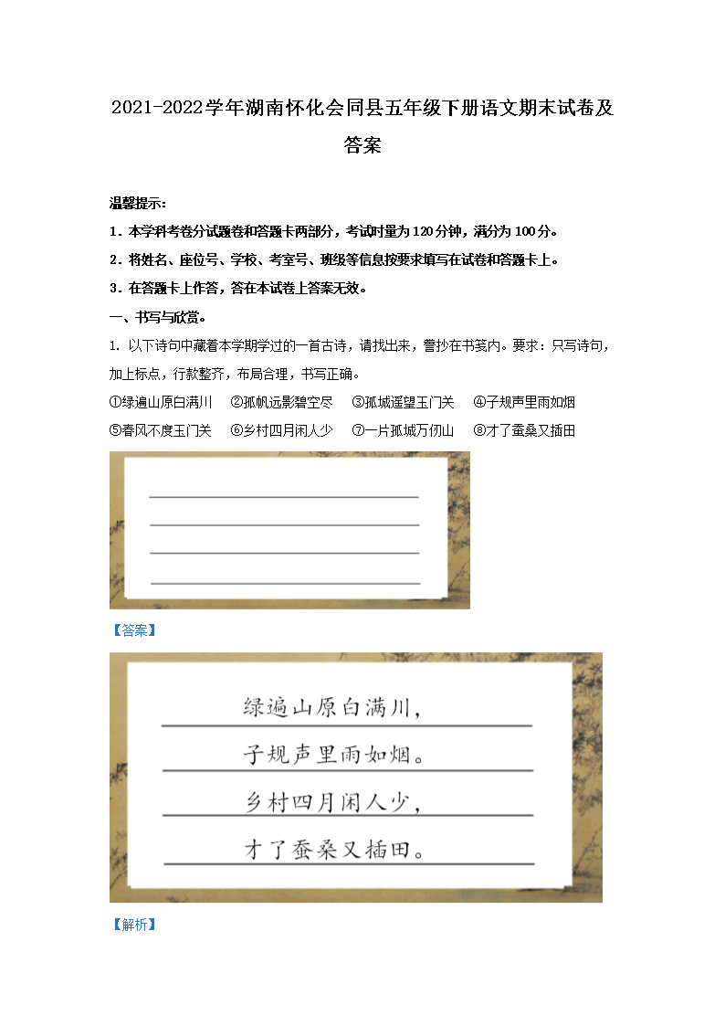 【文档名称】 2021-2022开云kaiyun(中国)年湖南怀化会同县五年级下册语文期末试卷及答案(Word版).doc