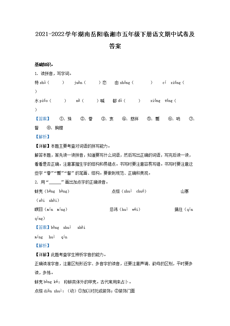 【文档名称】 2021-2022开云kaiyun(中国)年湖南岳阳临湘市五年级下册语文期中试卷及答案(Word版).doc