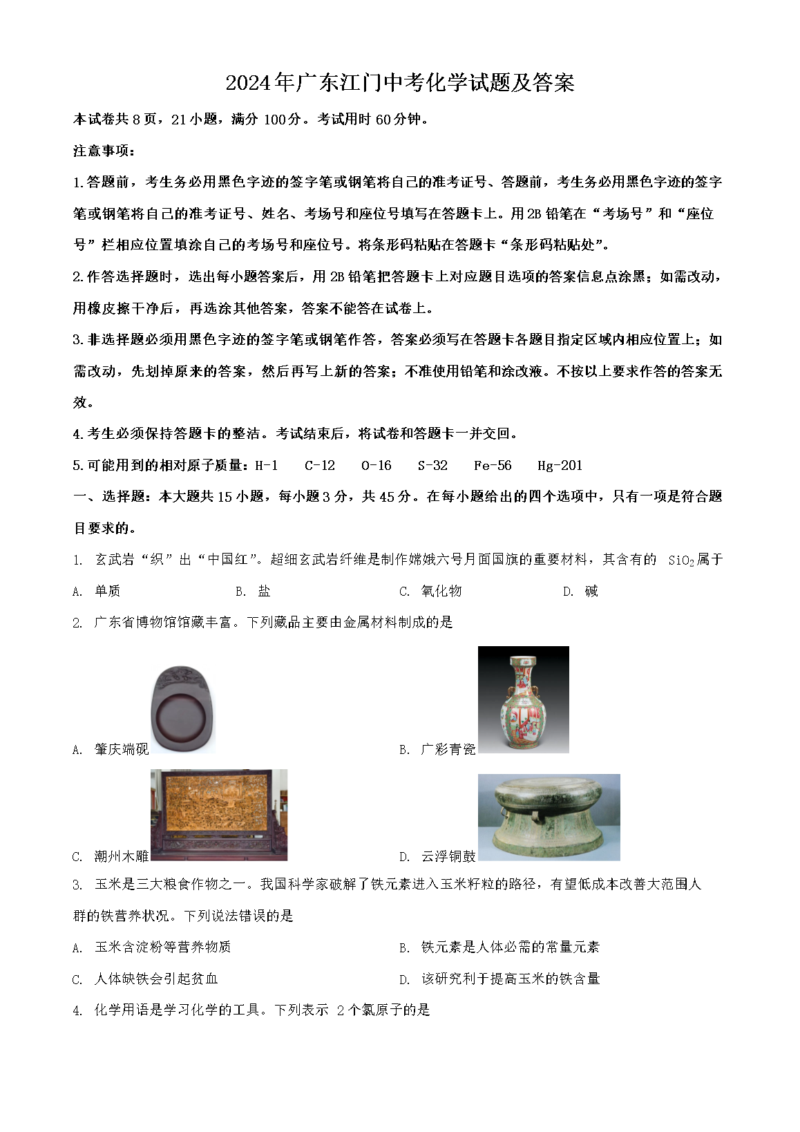 【文档名称】 2024年广东江门中考化开云kaiyun(中国)试题及答案(Word版).doc