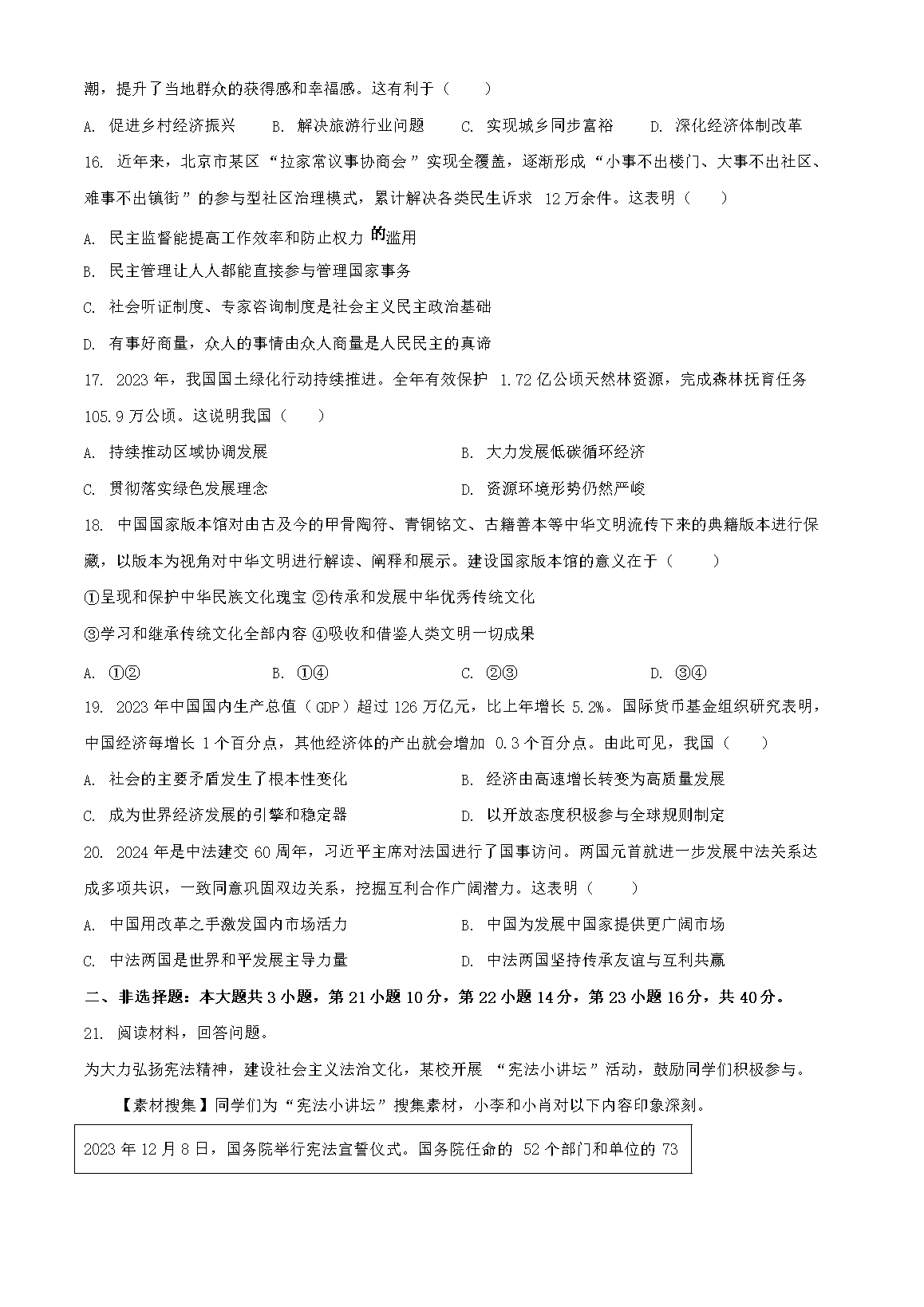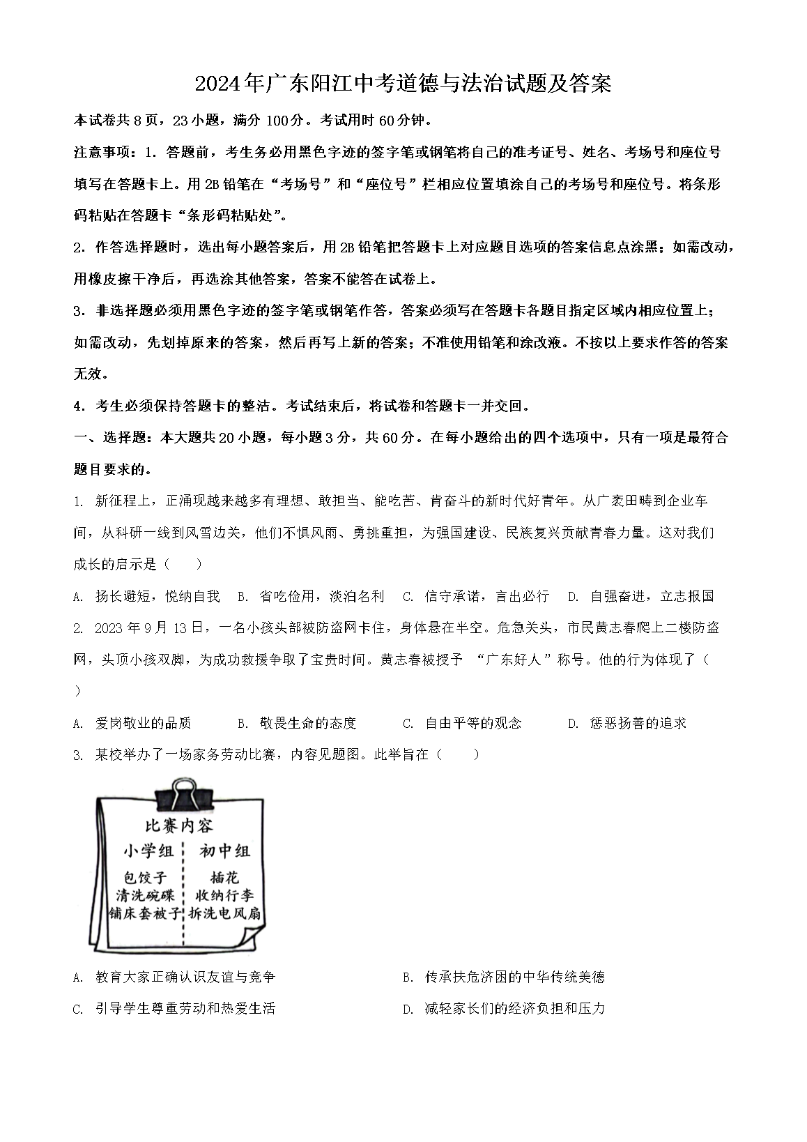 【文档名称】 2024年广东阳江中考道德与法治试题及答案(Word版).doc