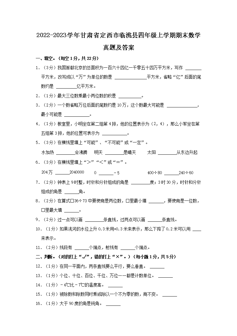 2022-2023开云kaiyun(中国)年甘肃省定西市临洮县四年级上开云kaiyun(中国)期期末数开云kaiyun(中国)真题及答案(Word版)