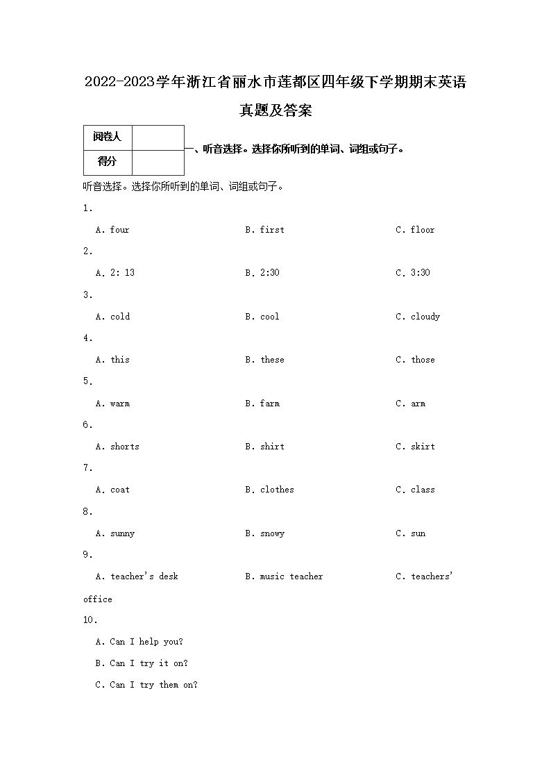 2022-2023开云kaiyun(中国)年浙江省丽水市莲都区四年级下开云kaiyun(中国)期期末英语真题及答案(Word版)