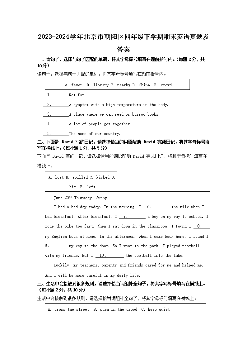 2023-2024开云kaiyun(中国)年北京市朝阳区四年级下开云kaiyun(中国)期期末英语真题及答案(Word版)