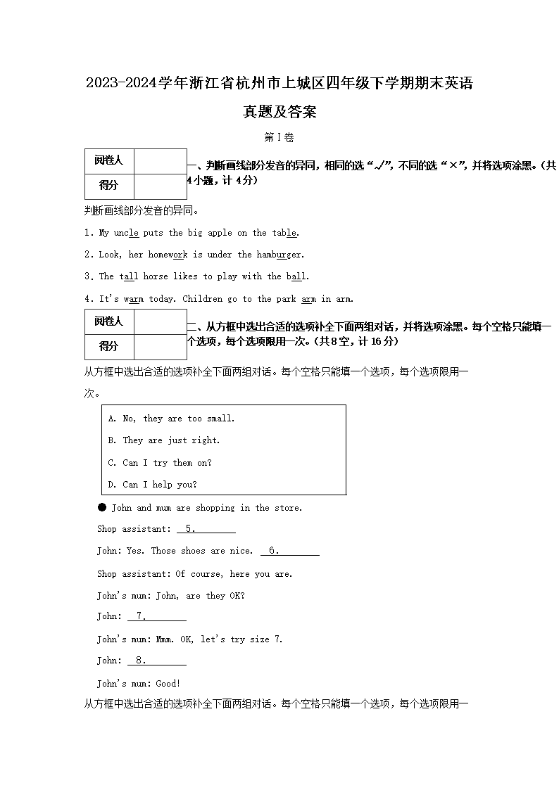 2023-2024开云kaiyun(中国)年浙江省杭州市上城区四年级下开云kaiyun(中国)期期末英语真题及答案(Word版)