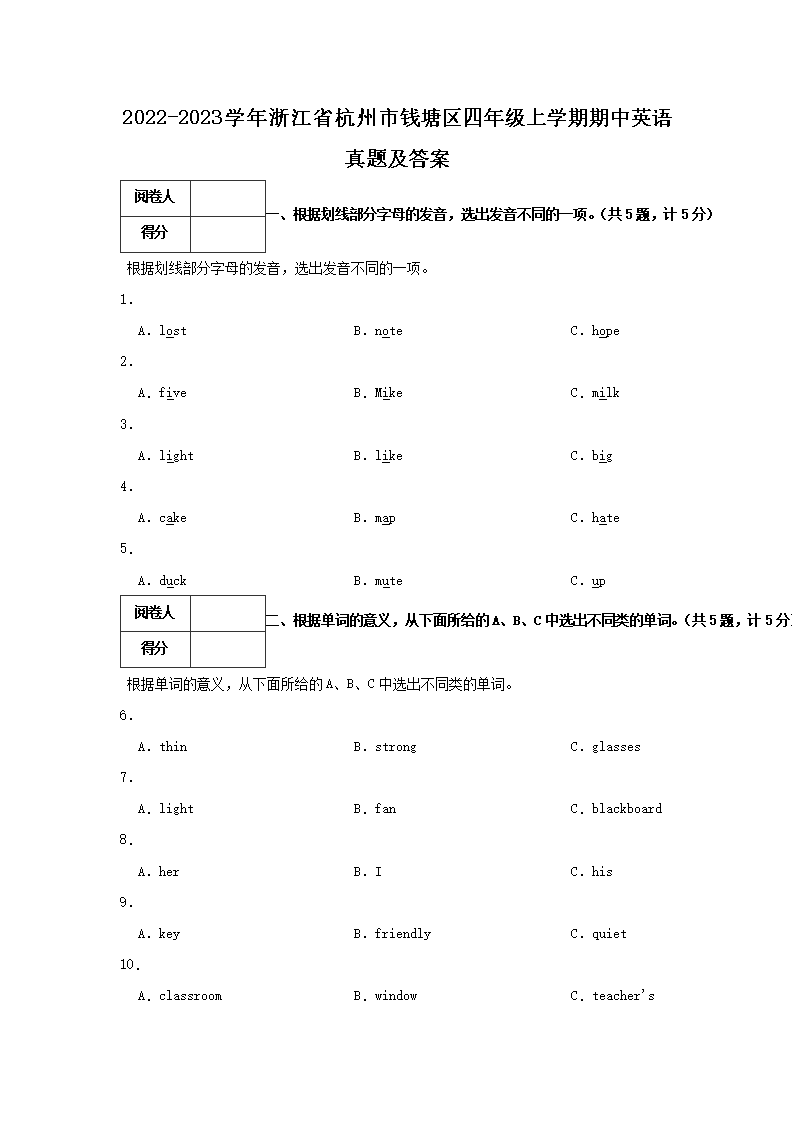 2022-2023开云kaiyun(中国)年浙江省杭州市钱塘区四年级上开云kaiyun(中国)期期中英语真题及答案(Word版)
