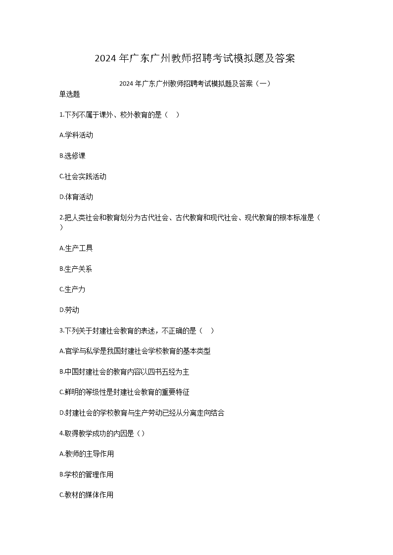 【文档预览】 开云网页版整理发布2024年广东广州教师招聘考试模拟题及答案(Word版),前五页预览如下: