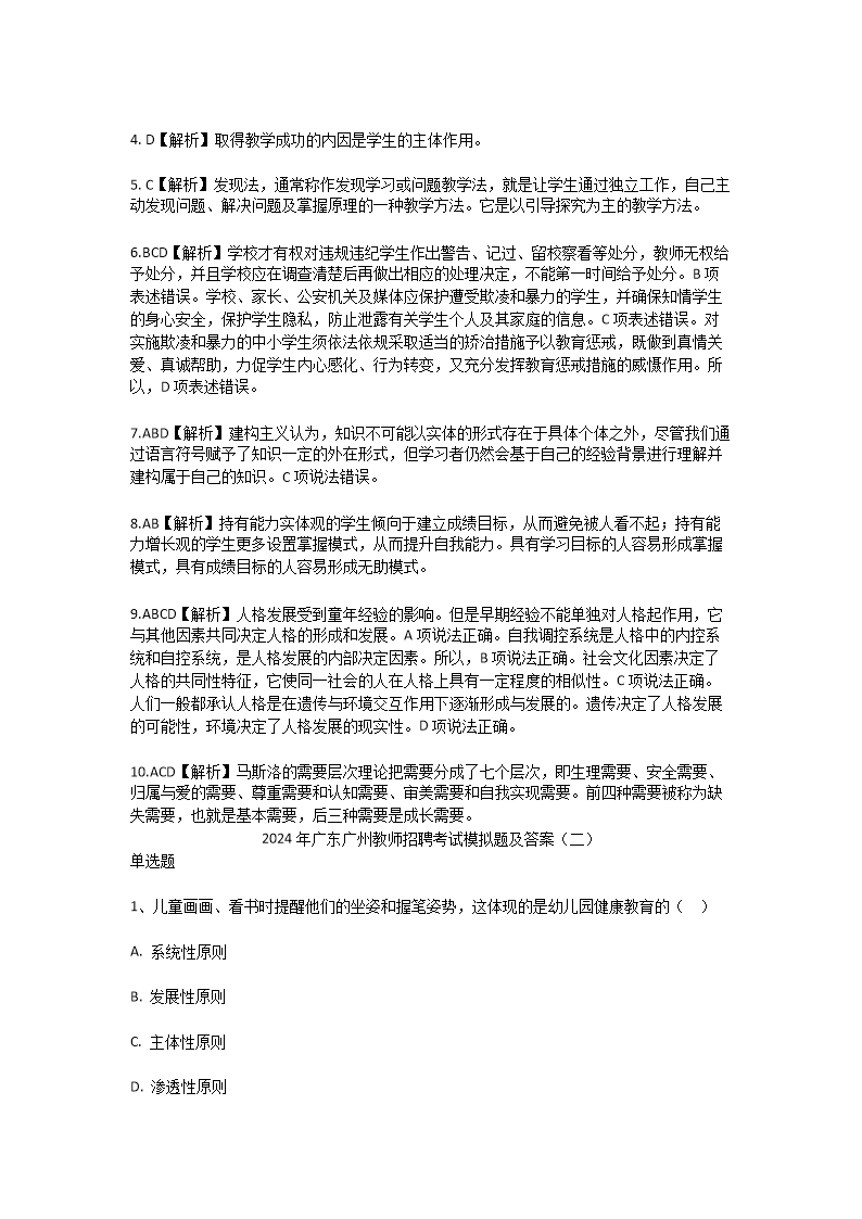 【文档名称】 2024年广东广州教师招聘考试模拟题及答案(Word版).doc