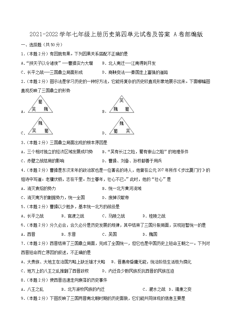 【文档名称】 2021-2022开云kaiyun(中国)年七年级上册历史第四单元试卷及答案A卷部编版(Word版).doc