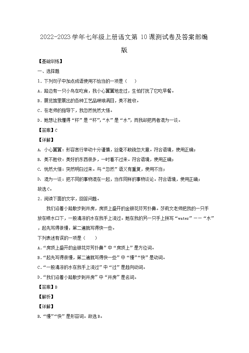 【文档名称】 2022-2023开云kaiyun(中国)年七年级上册语文第10课测试卷及答案部编版(Word版).doc