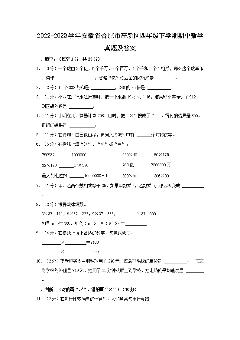 2022-2023开云kaiyun(中国)年安徽省合肥市高新区四年级下开云kaiyun(中国)期期中数开云kaiyun(中国)真题及答案(Word版)