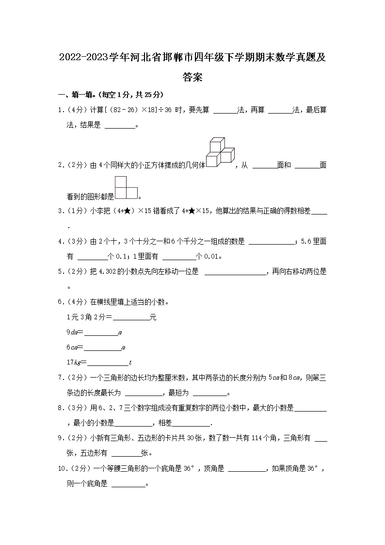 2022-2023开云kaiyun(中国)年河北省邯郸市四年级下开云kaiyun(中国)期期末数开云kaiyun(中国)真题及答案(Word版)