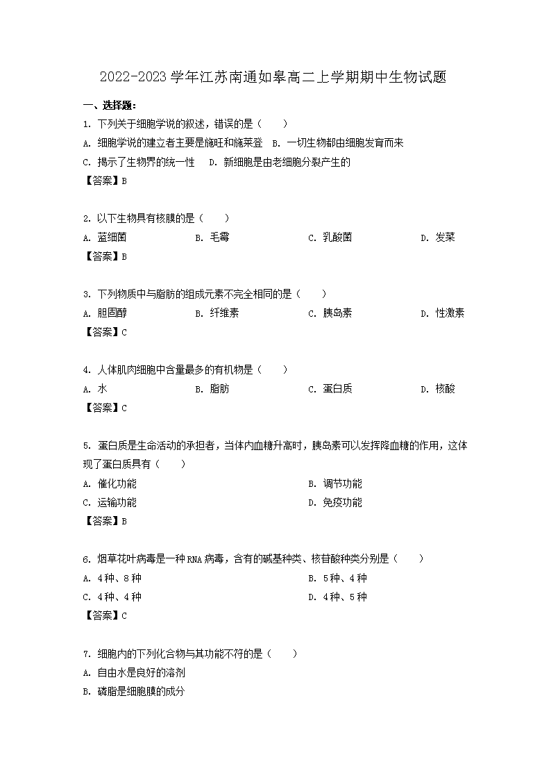 2022-2023开云kaiyun(中国)年江苏南通如皋高二上开云kaiyun(中国)期期中生物试题(Word版)
