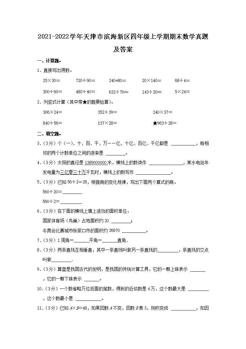 2021-2022开云kaiyun(中国)年天津市滨海新区四年级上开云kaiyun(中国)期期末数开云kaiyun(中国)真题及答案(Word版)
