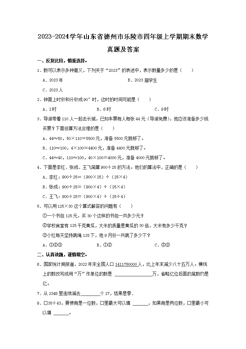 2023-2024开云kaiyun(中国)年山东省德州市乐陵市四年级上开云kaiyun(中国)期期末数开云kaiyun(中国)真题及答案(Word版)
