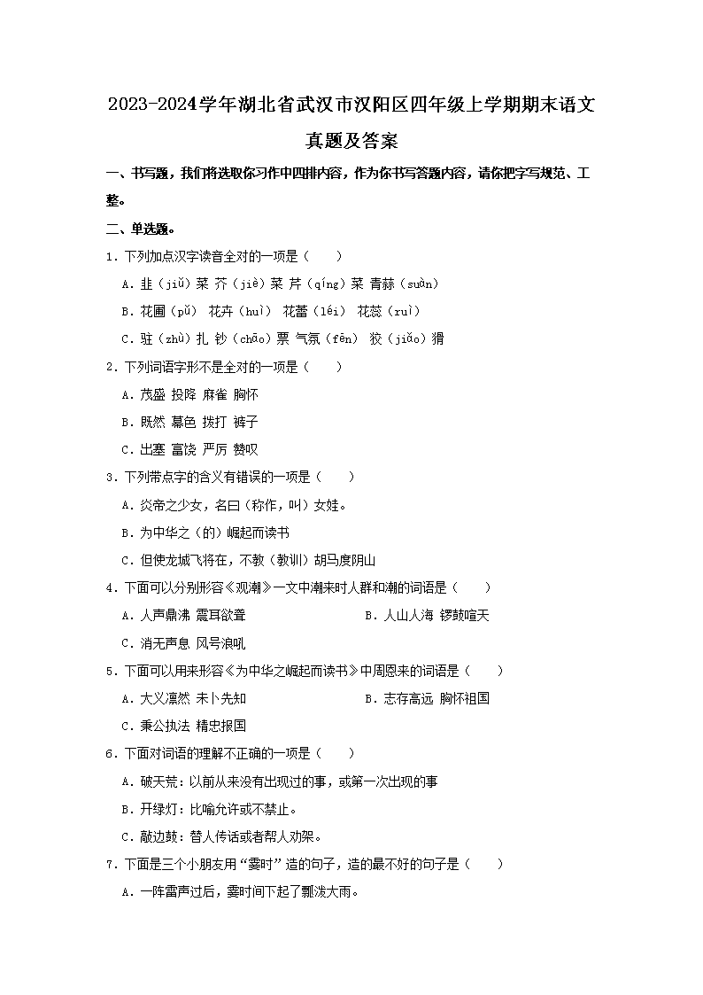 2023-2024开云kaiyun(中国)年湖北省武汉市汉阳区四年级上开云kaiyun(中国)期期末语文真题及答案(Word版)