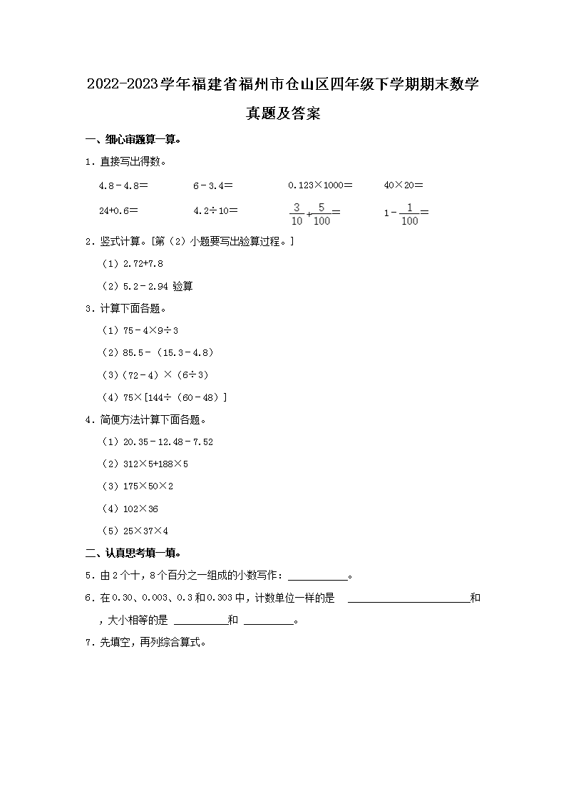 2022-2023开云kaiyun(中国)年福建省福州市仓山区四年级下开云kaiyun(中国)期期末数开云kaiyun(中国)真题及答案(Word版)