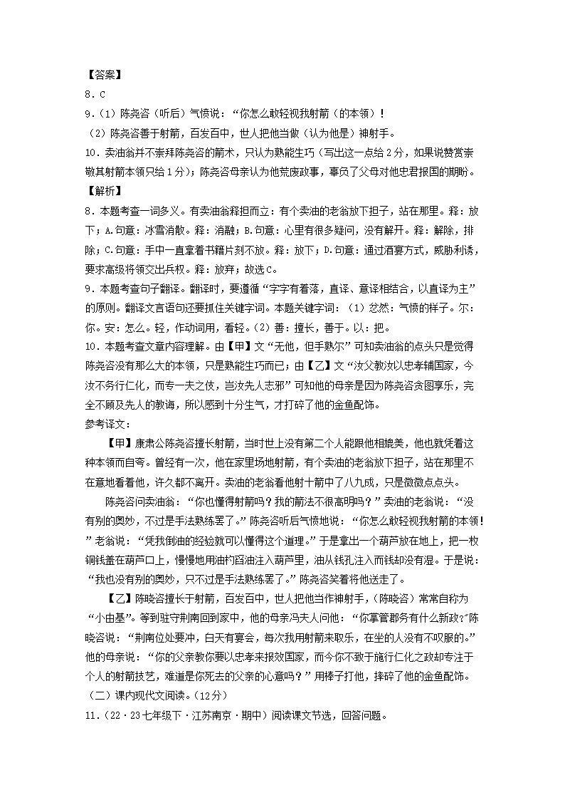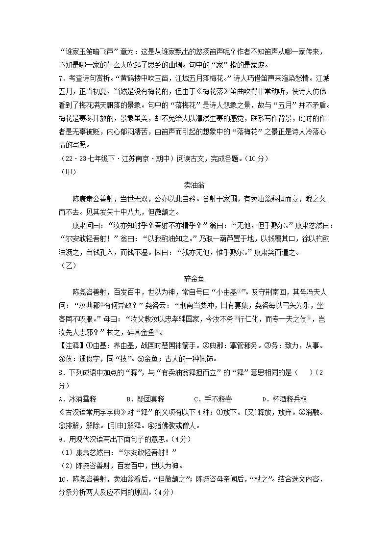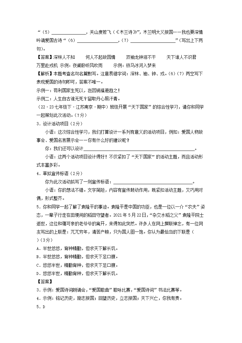 - 2022-2023开云kaiyun(中国)年江苏南京鼓楼区七年级下册语文期中试卷及答案