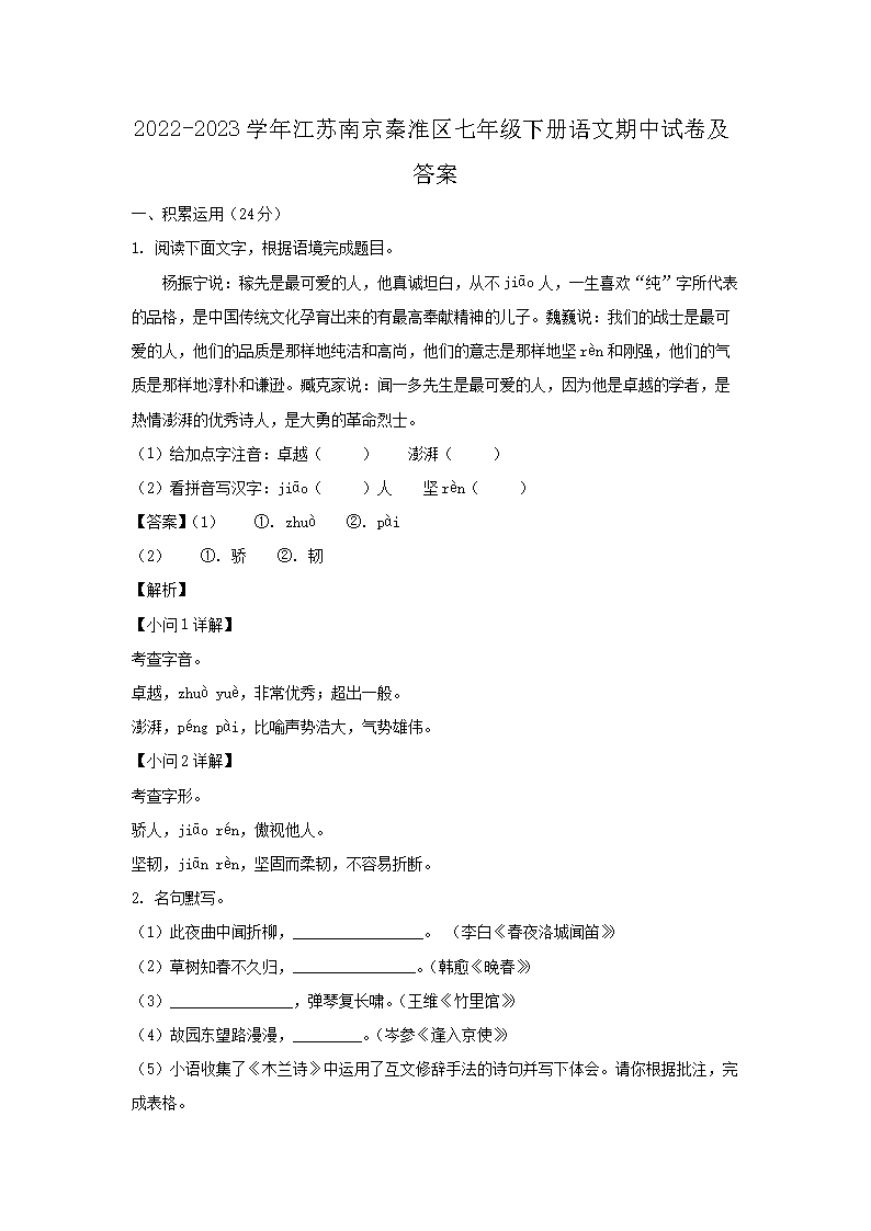 【文档名称】 2022-2023开云kaiyun(中国)年江苏南京秦淮区七年级下册语文期中试卷及答案(Word版).doc
