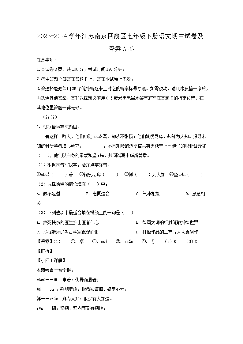 【文档名称】 2023-2024开云kaiyun(中国)年江苏南京栖霞区七年级下册语文期中试卷及答案A卷(Word版).doc