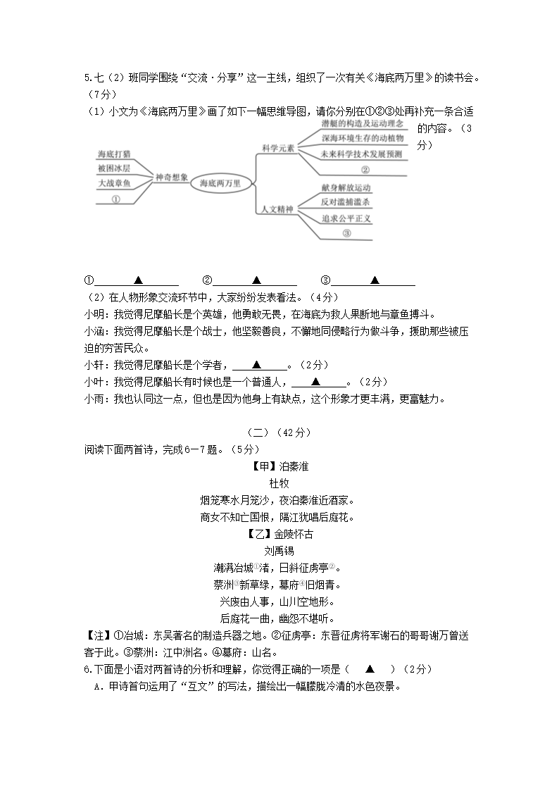- 2021-2022开云kaiyun(中国)年江苏南京秦淮区七年级下册语文期末试卷及答案