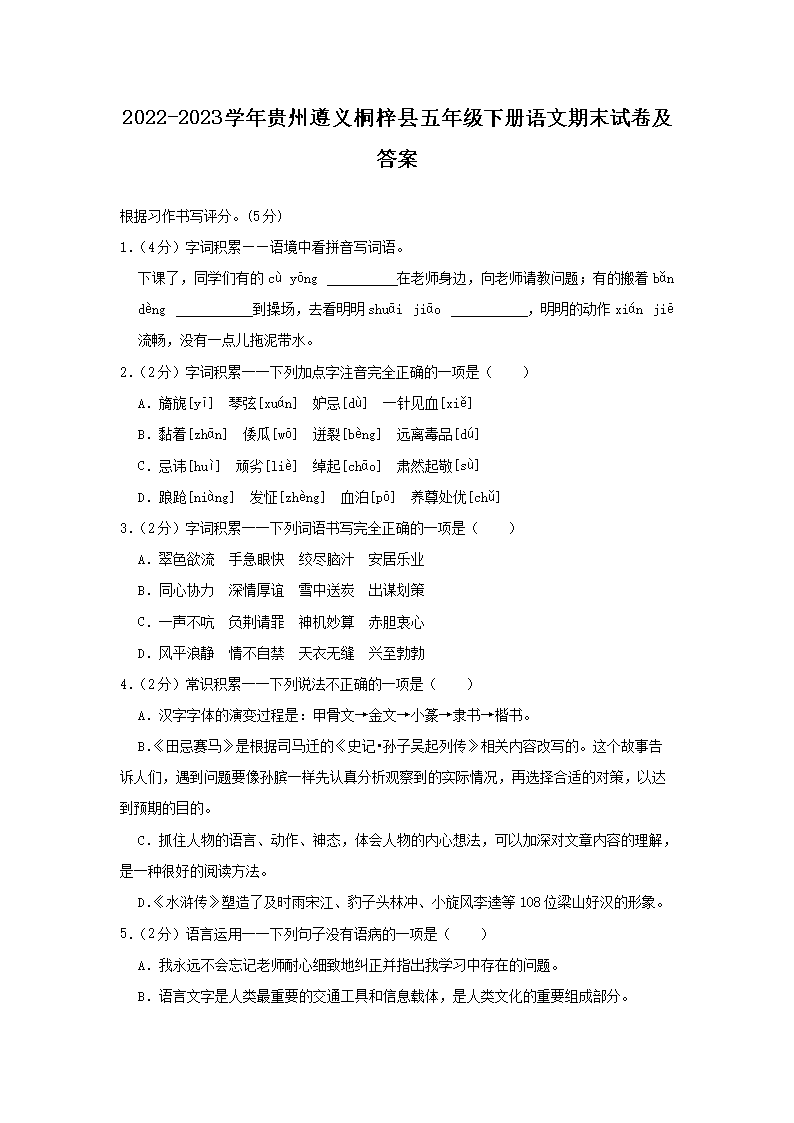 【文档名称】 2022-2023开云kaiyun(中国)年贵州遵义桐梓县五年级下册语文期末试卷及答案(Word版).doc