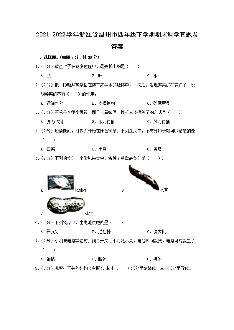 2021-2022开云kaiyun(中国)年浙江省温州市四年级下开云kaiyun(中国)期期末科开云kaiyun(中国)真题及答案(Word版)
