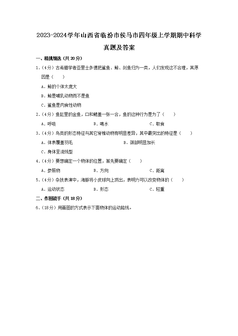 2023-2024开云kaiyun(中国)年山西省临汾市侯马市四年级上开云kaiyun(中国)期期中科开云kaiyun(中国)真题及答案(Word版)