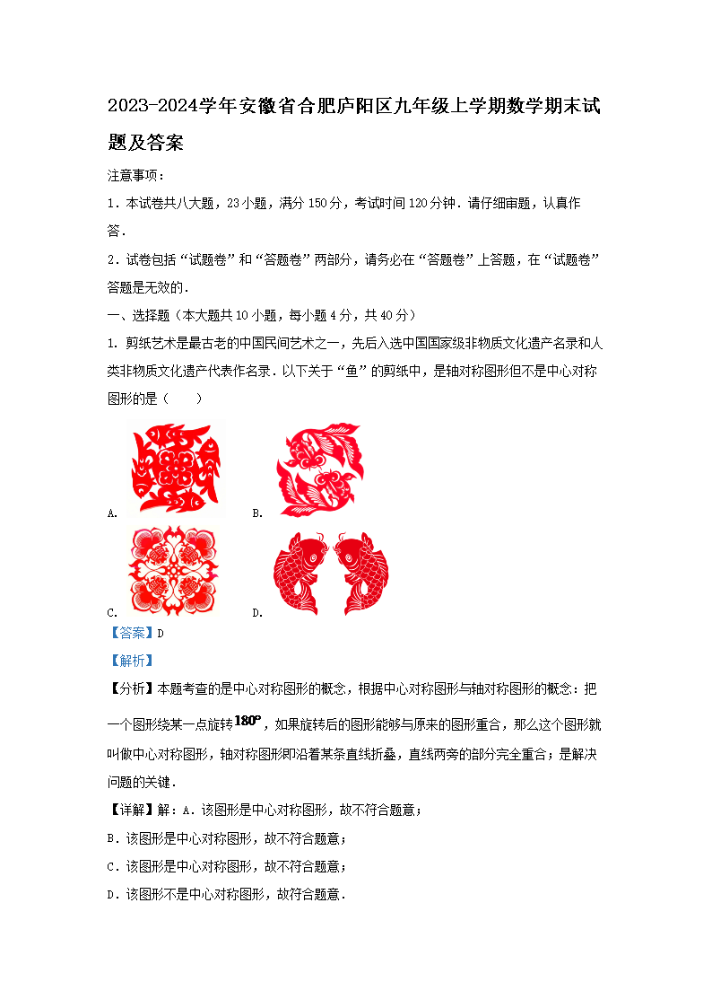 2023-2024开云kaiyun(中国)年安徽省合肥庐阳区九年级上开云kaiyun(中国)期数开云kaiyun(中国)期末试题及答案(Word版)