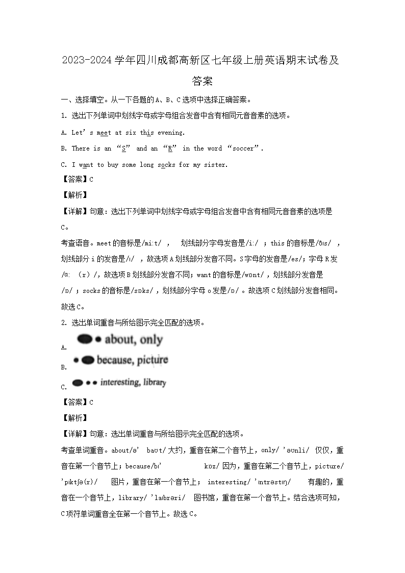 【文档名称】 2023-2024开云kaiyun(中国)年四川成都高新区七年级上册英语期末试卷及答案(Word版).doc