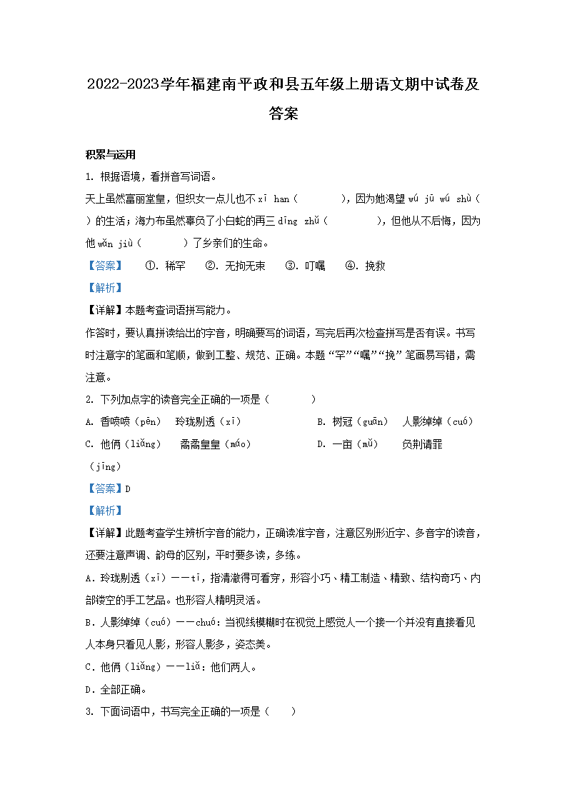 【文档名称】 2022-2023开云kaiyun(中国)年福建南平政和县五年级上册语文期中试卷及答案(Word版).doc