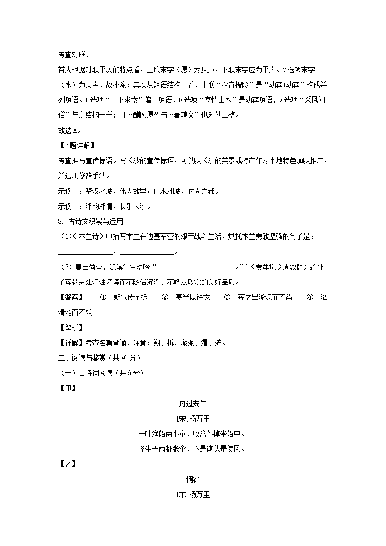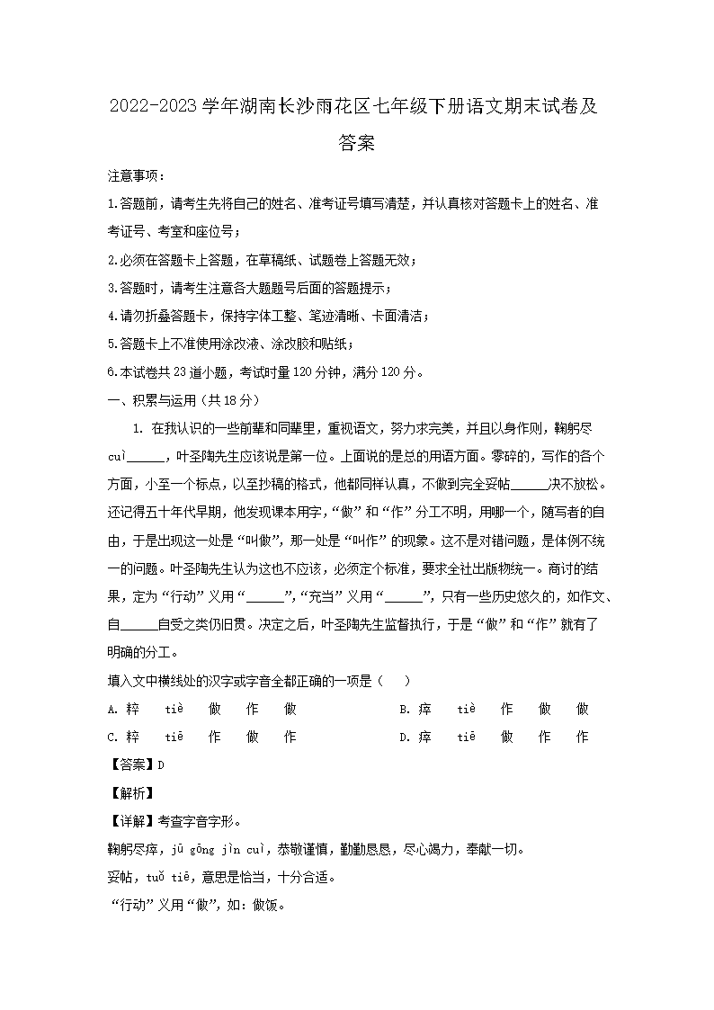 【文档名称】 2022-2023开云kaiyun(中国)年湖南长沙雨花区七年级下册语文期末试卷及答案(Word版).doc