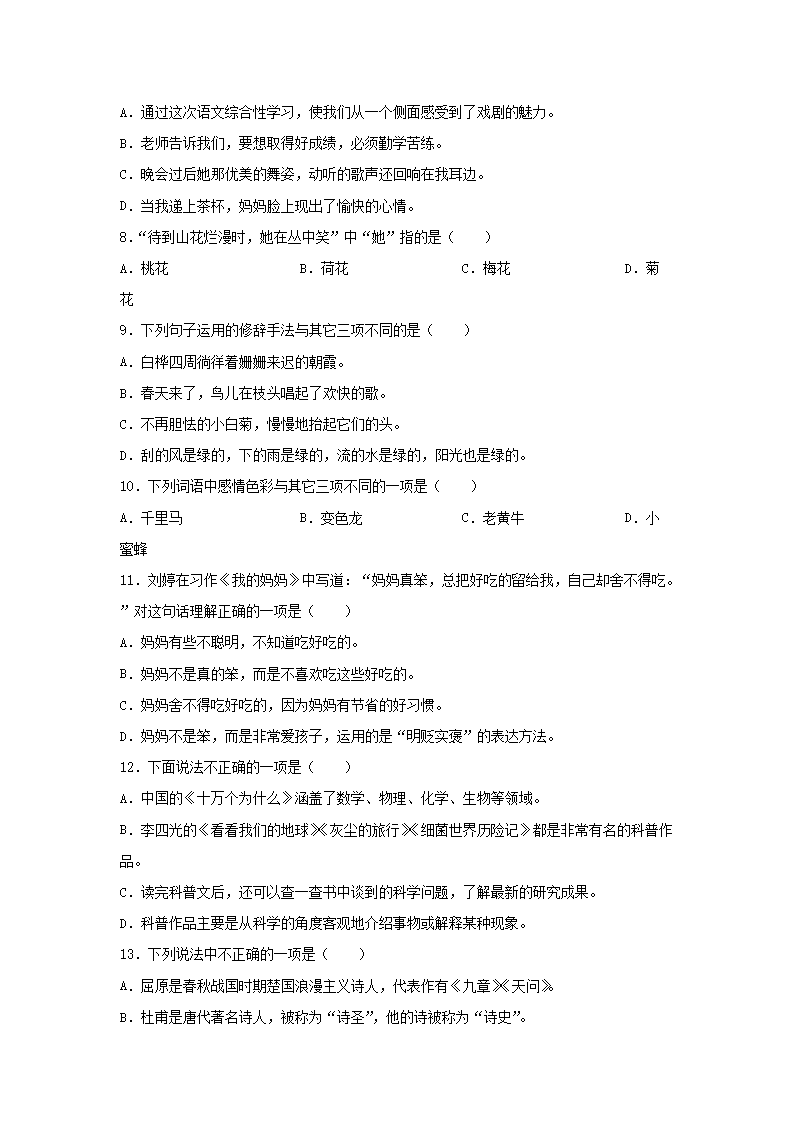 - 2022-2023开云kaiyun(中国)年广东省深圳市龙华区四年级下开云kaiyun(中国)期期中语文真题及答案