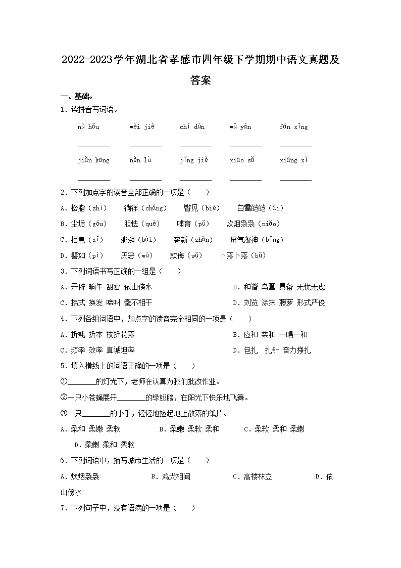2022-2023开云kaiyun(中国)年湖北省孝感市四年级下开云kaiyun(中国)期期中语文真题及答案(Word版)