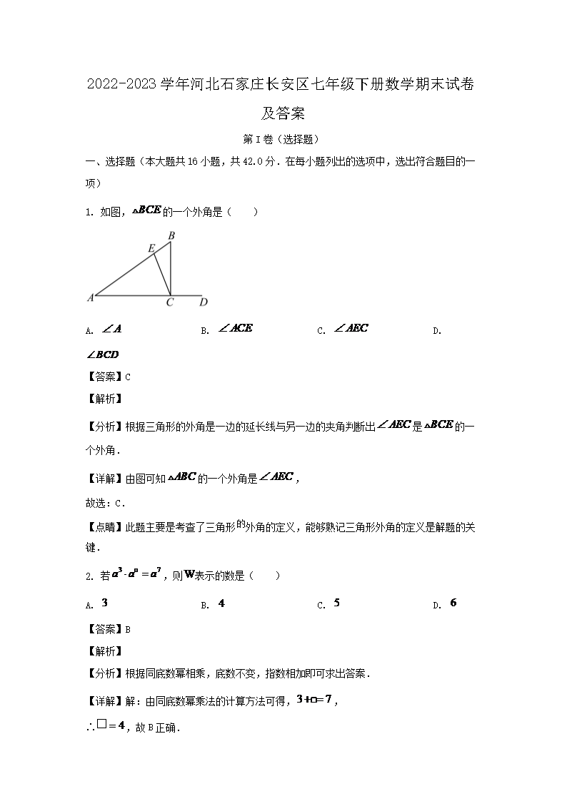 2022-2023开云kaiyun(中国)年河北石家庄长安区七年级下册数开云kaiyun(中国)期末试卷及答案(Word版)