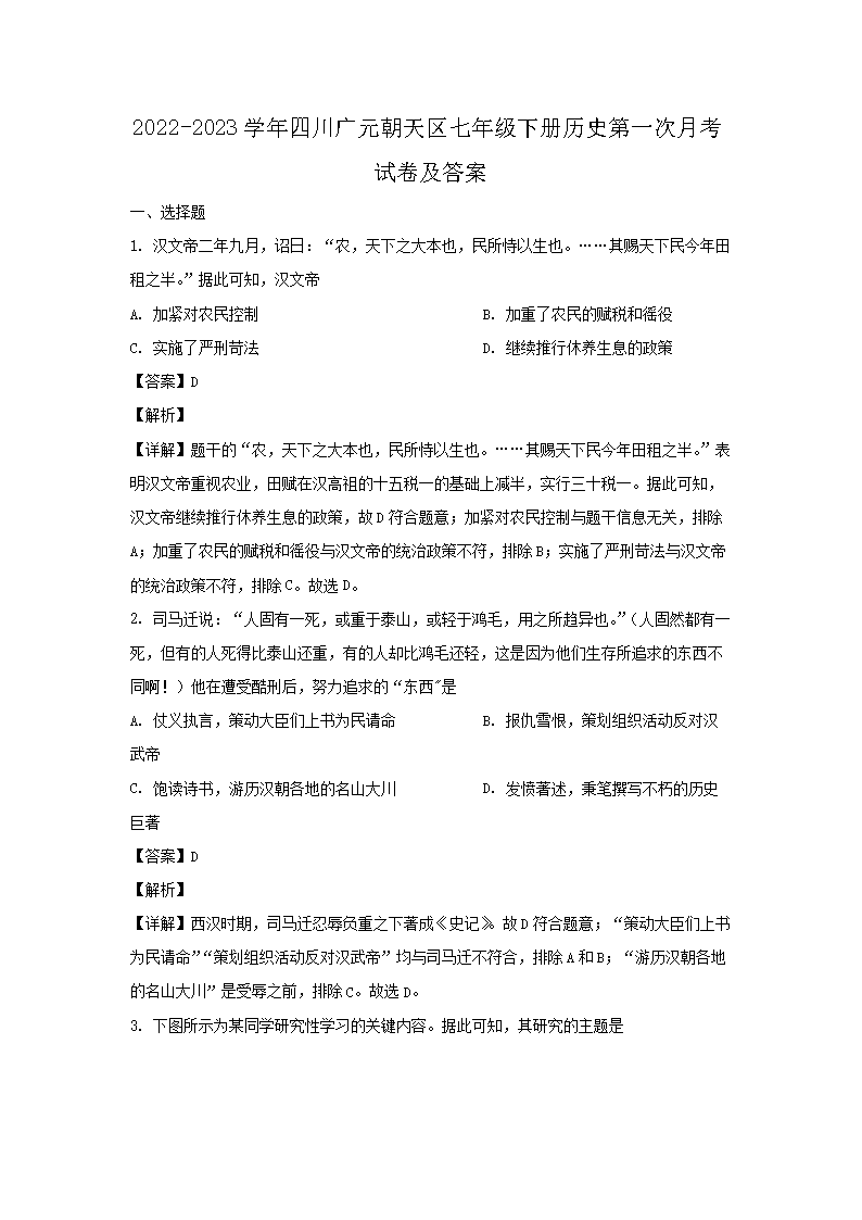 【文档名称】 2022-2023开云kaiyun(中国)年四川广元朝天区七年级下册历史第一次月考试卷及答案(Word版).doc