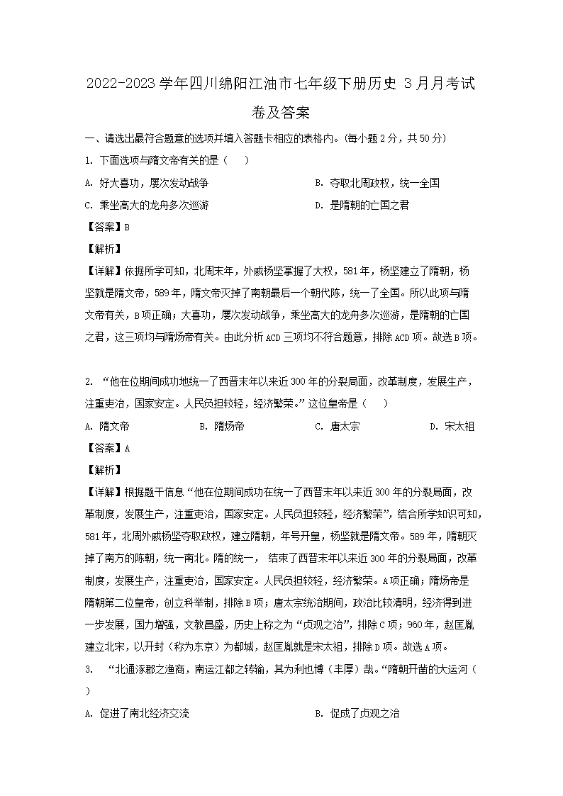 【文档名称】 2022-2023开云kaiyun(中国)年四川绵阳江油市七年级下册历史3月月考试卷及答案(Word版).doc