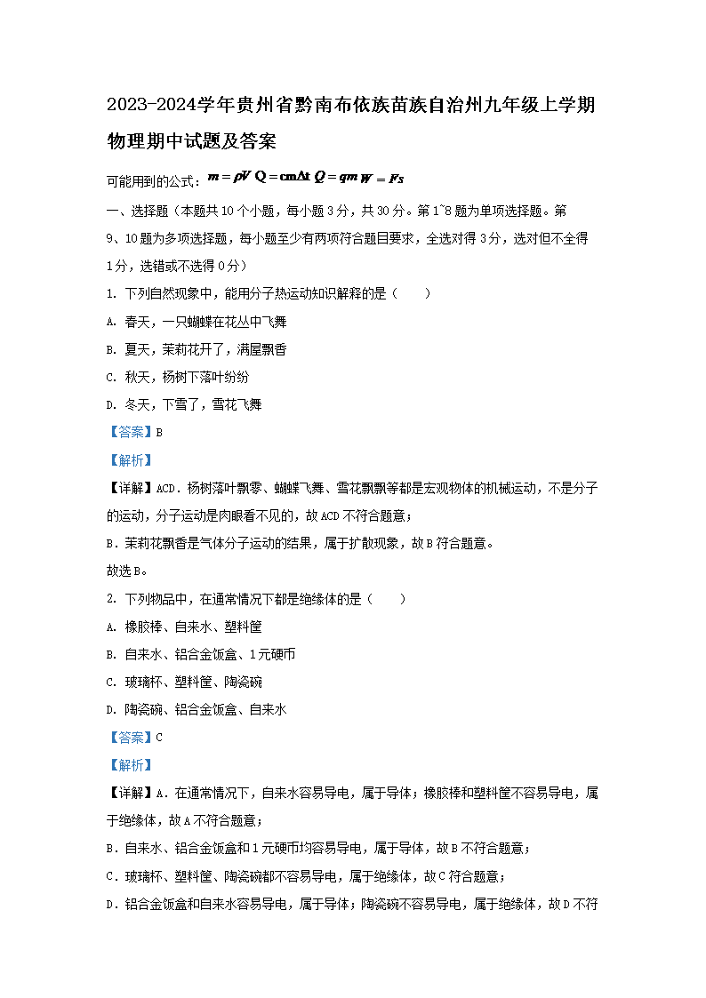 2023-2024开云kaiyun(中国)年贵州省黔南布依族苗族自治州九年级上开云kaiyun(中国)期物理期中试题及答案(Word版)